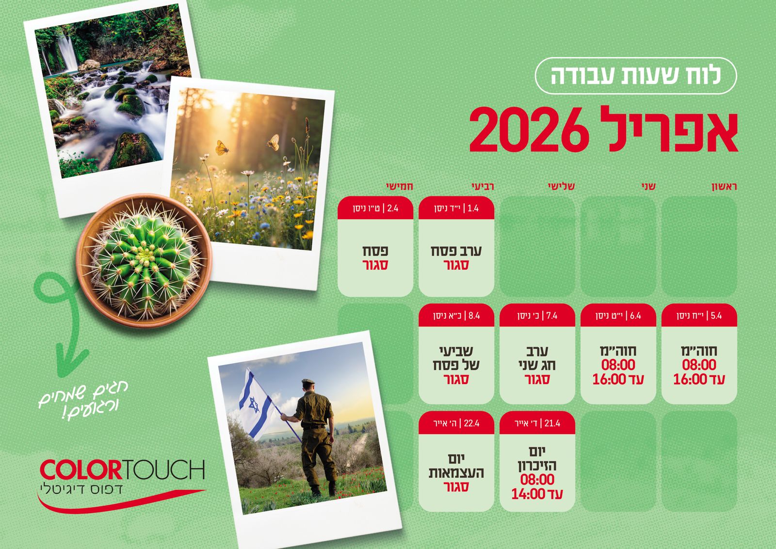 שעות פתיחה ימי ו`: סגור לקוחות יקרים אין קבלת קהל להדפסות במקום ! ניתן לבצע הזמנות דרך הטלפון, האתר או ע"י שליחת קבצים מוכנים במייל. ניתן להגיע לאיסוף עבודה מוכנה או ע"י תיאום שילוח של עבודה. בברכה ובריאות טובה, קולור טאץ` :)